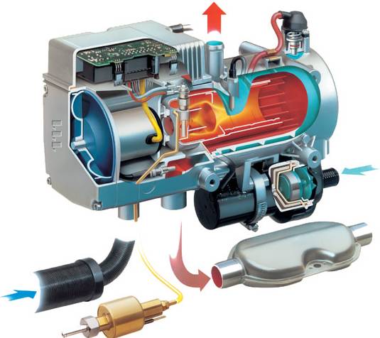 Прибор устанавливается в систему охлаждения двигателя. Работая, он передает тепло двигателю и теплообменнику. Тепловая энергия выходит из обменника автомобиля и распределяется по салону. То тепло, которое остается, используется для того, чтобы подогреть охлаждающую жидкость двигателя. У подогревателя предусмотрены 4 ступени нагрева: максимальная, большая, средняя и малая.