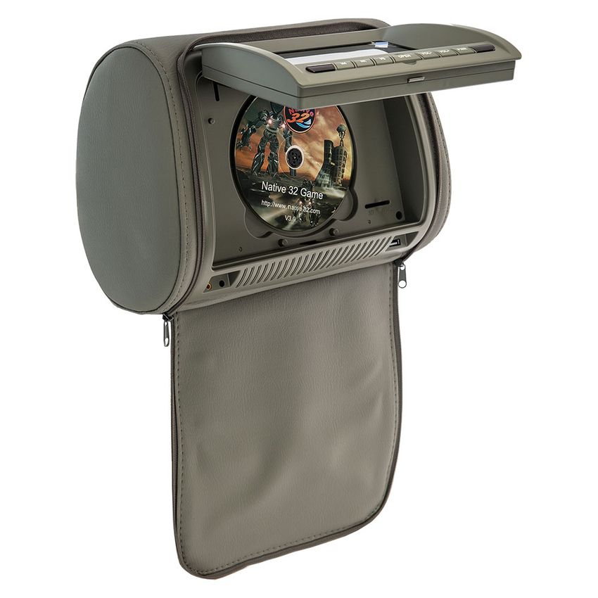 Для установки подголовников Вам нужно отрегулировать расстояние между металлическими ножками в пределах от 11 до 20 сантиметров и подобрать уплотнительные втулки подходящего диаметра. Последние есть в комплекте поставки. Кроме этого, с подголовниками Вы получите диск на 300 игр с проводным джойстиком, что точно обрадует Ваших маленьких пассажиров.