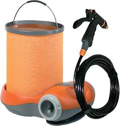 Устройство создает высокое давление воды, и при этом ее нужно совсем немного, что очень удобно в «полевых» условиях. А непосредственно воду вы можете налить как в складное ведро-трансформер, которое входит в комплект, так и в любую другую емкость (обычное ведро, бочку). Эргономичный пистолет-распылитель с регулировкой струи поможет вам аккуратно промыть все места в автомобиле – и доступные, и труднодоступные. А сетчатый фильтр защитит распылитель от загрязнений.