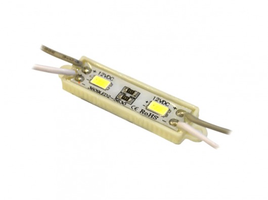 Линейный светодиодный модуль PL 5630-2 IP65 2800Lm это 2 диода SMD 5630 холодного белого цвета и резисторы с рабочим напряжением 12V, которые находятся в пластиковом корпусе. Яркость 1 диода составляет 70Lm, а всей упаковки — 2800Lm, что дает вам яркое и насыщенное свечение. Корпус залит двухкомпонентным компаундом. Поэтому вы можете использовать светодиодный модуль led в условиях  повышенной влажности и резкого перепада внешней температуры от  -30 до +50 градусов.