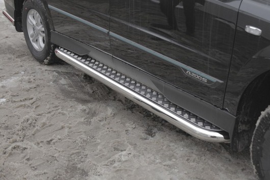 Пороги на SsangYong Actyon Sport – это боковые подножки из нержавеющей стали диаметром 76 мм, которые позволяют более комфортно входить и выходить из салона автомобиля. Подножки SsangYong Actyon Sport очень прочные, надежные и долговечные: они не боятся коррозии, сколов и царапин и выдерживают большие нагрузки.