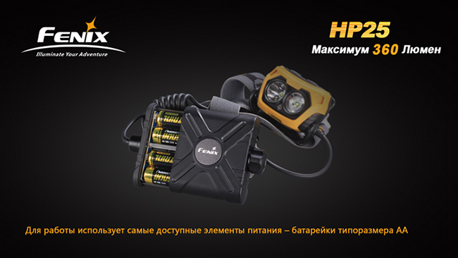 Питается налобник от 4 аккумуляторов АА ("пальчик"). Рекомендуется использовать аккумуляторы от одного производителя. Благодаря конструкции батарейного блока налобный фонарь Fenix HP25 можно эффективно использовать при низких температурах — другие фонари работают в холод намного хуже.