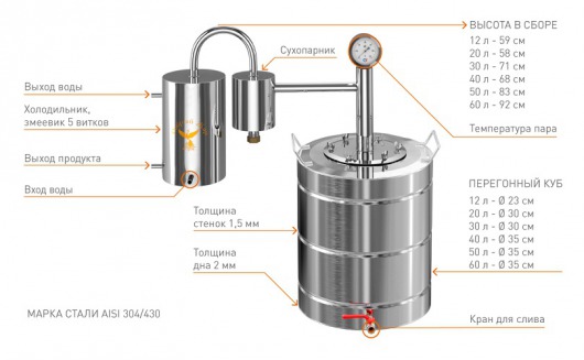 С помощью этого самогонного аппарата средней вместимости с сухопарником и баком на 30 литров вы легко сможете приготовить качественные спиртные напитки в домашних условиях. При этом вам не придется осваивать сложные технологии самогоноварения: достаточно просто подключить змеевик к проточной воде, залить в бак брагу и поставить аппарат на плиту (подойдет как газовая, так и электрическая плита).