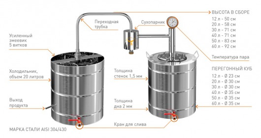 С помощью этого самогонного аппарата большой вместимости с сухопарником и баком на 120 литров вы легко сможете приготовить качественные спиртные напитки в любых условиях, например, на даче или в деревне. Этот аппарат не обязательно подключать к водопроводу: для охлаждения змеевика в нем предусмотрен дополнительный резервуар, который заполняется холодной водой. При этом вам не придется осваивать сложные технологии самогоноварения: достаточно просто залить в бак брагу и поставить аппарат на плиту (подойдет как газовая, так и электрическая плита) или на костер (почему бы и нет?).