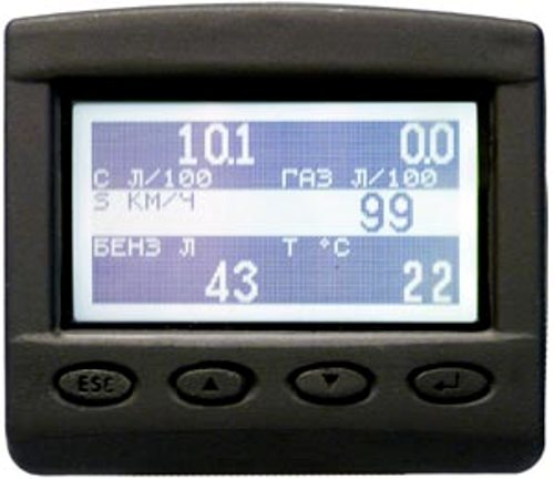 • На экране компьютера отображаются параметры маршрута (скорость, средняя скорость, мгновенный расход топлива л/100км, средний расход топлива л/100км). Плюс к этому показывается текущие время и дата.