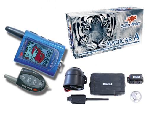 Автосигнализация комплектуется четырехкнопочным брелоком-коммуникатором с большим высокоинформативным ЖК-дисплеем. На экране отображаются данные о состоянии автомобиля: время работы двигателя в автоматическом режиме, температура в салоне, напряжение аккумулятора, состояние батареи брелока (всего один элемент ААА) и множество другой информации, позволяющей держать владельца в курсе всего происходящего с его машиной. Дальность действия двустороннего канала в SCHER-KHAN MAGICAR А составляет 800 метров .