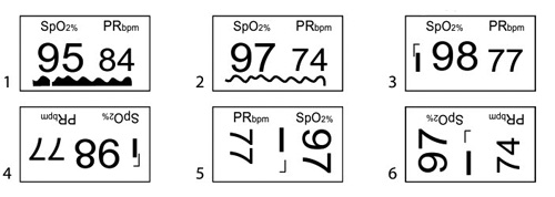 Отображает показания в 6-ти режимах в зависимости от ориентации в пространстве. Переключая при помощи клавиши эти режимы, информация может отображаться в портретном или ландшафтном виде с включенной или выключенной пульсовой гистограммой. Кроме того, в приборе предусмотрена регулировка яркости. Таким образом, 6 режимов отображения информации на дисплее позволяют подстроить прибор для максимального удобства работы.