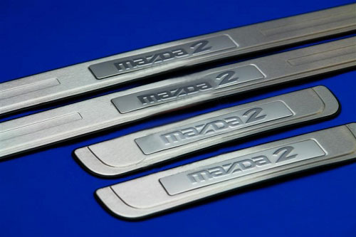 Накладки на пороги Mazda 2 усовершенствуют внешность автомобиля, придадут ему уникальность и неповторимость. При установки крепятся с помощью двухстороннего скотча.