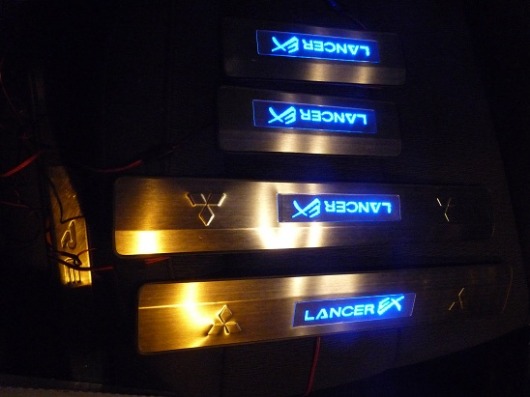 Светящиеся накладки на пороги Mitsubishi Lancer X не входят ни в одну комплектацию этой модели автомобиля. Они органично впишутся в интерьер вашего автомобиля, дополняя светящиеся элементы панели управления, и позволят вам сделать свой автомобиль еще более оригинальным и стильным. Каждое открытие двери будет сопровождаться теплым синим светом. Кроме того, накладки оснащены специальными полосками, которые обеспечивают плотное соприкосновение ноги и порога.