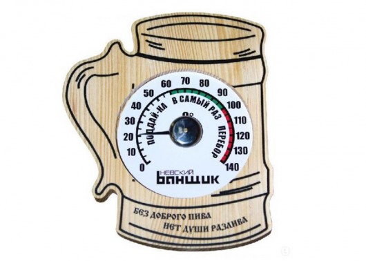 Термометр "Невский банщик" предназначен для измерения температуры в парной. Оригинальная температурная шкала подскажет вам, в какой момент нужно поддать пару, а когда лучше выйти из парной и дать ей немного остыть. Стилизованный градусник для бани в деревянном корпусе в виде пивной кружки станет хорошим подарком друзьям и знакомым, у которых есть своя баня или сауна. Изготовлен из экологически чистых материалов, не содержит ртути.