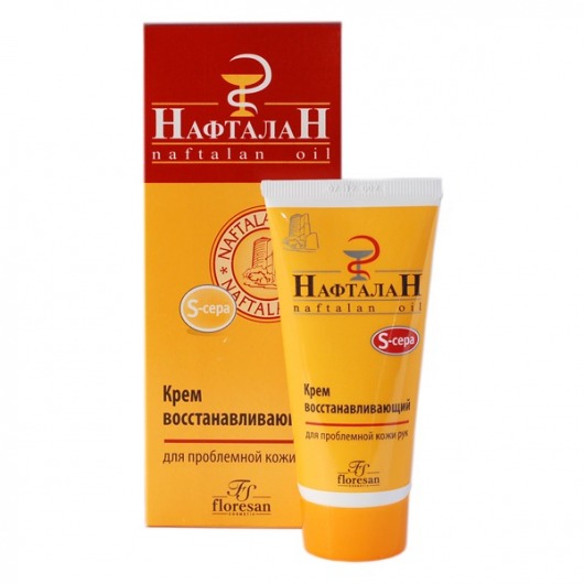 Крем восстанавливающий "Нафталан S" для проблемной кожи рук — специальный восстанавливающий крем для рук основан на обессмоленной нафталановой нефти. Крем предназначен для проблемной кожи рук, склонной к образованию трещин, чрезмерной сухости, плохо заживающей после различных повреждений. Особенно рекомендуется после частого контакта с водой, агрессивными средами, моющими средствами.