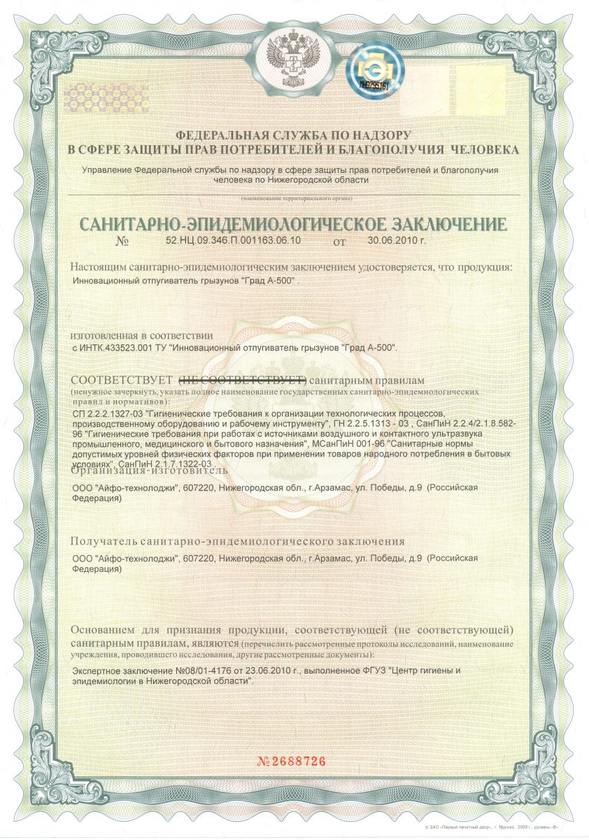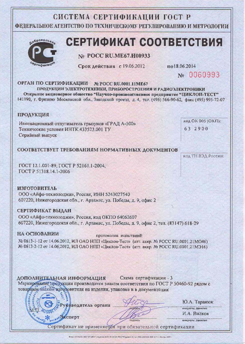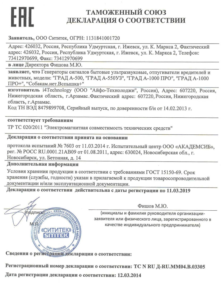 Отпугиватель прошел необходимые проверки и соответствует требованиям Таможенного союза