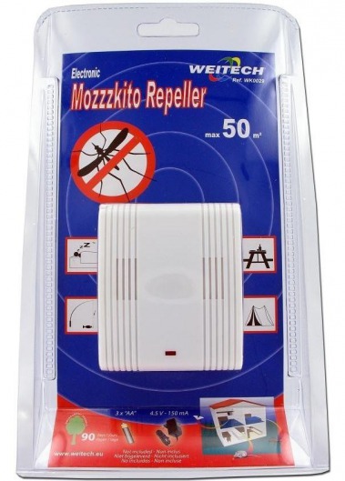 Отпугиватель комаров Weitech WK-0029 — эффективный прибор для отпугивания кровососущих насекомых с помощью ультразвука. Используется как внутри помещения, так и снаружи, и способен защитить территорию  до 40 м2. Ультразвук не наносит вреда людям и домашним животным, как большинство классических средств: пластинки, спирали, репелленты и аэрозоли). Поэтому такой прибор может использоваться где и когда угодно.