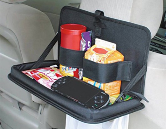 Столик JK-59 крепится на подголовник переднего сидения, для того, чтобы пассажирам на заднем сидении было удобней, например, обедать, в дальней дороге. Столик имеет специальные карманы для напитков. Причем карманы регулируются в зависимости от объема посуды. Размеры самого столика 250х350х30 мм.