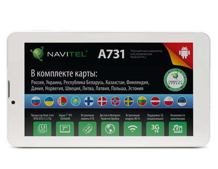 Портативный автомобильный gps навигатор Navitel A 731 имеет емкостный 7-дюймовый экран, FM-трансмиттер, поддерживает навигационное программное обеспечение — Навител 9.1 и предустановленные карты Россия, Украина, Республика Беларусь, Казахстан, Финляндия, Прибалтика, Дания, Норвегия, Швеция и Польша.