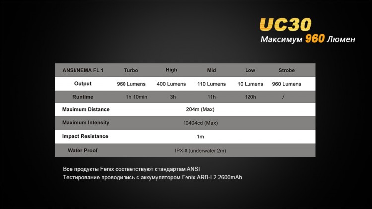 Ручной фонарь Fenix UC30 оснащен диодом модели Cree XM-L2 (U2) в состоянии предложить яркость света до 960 люмен. Этот компактный фонарь подойдет для решения ежедневных задач, использования на даче, во время отдыха на природе или серьезного туристического похода.