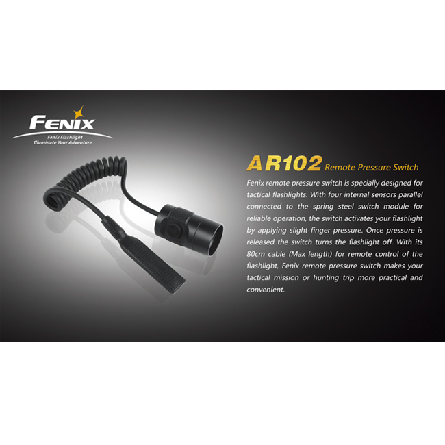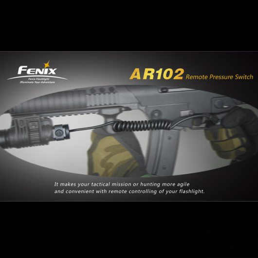 Назначение тактической кнопки — обеспечить мгновенный доступ к свету фонаря в то же время, когда охотник прицеливается. Fenix AR102 герметично присоединяется к фонарю вместо торцевой крышки. От корпуса кнопки отходит витой шнур, соединенный с контактной площадкой. Эта площадка и выполняет функцию кнопки. Пользователь может разместить ее в удобном ему месте на поверхности ружья таким образом, чтобы свободно доставать до кнопки пальцем. Благодаря тому, что витой шнур растягивается, контактная площадка может находиться на расстоянии 23-80 см от фонаря.