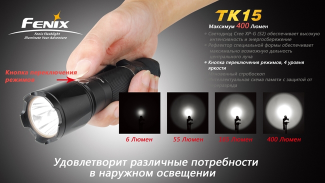 Тактический светодиодный фонарь Fenix TK15 использует популярный современный светодиод XP-G(S2), который позволяет модели выдавать на максимуме яркость до 400 люмен и луч света до 252 метров. Всего фонарь имеет 4 уровня яркости:
