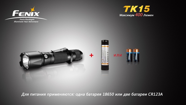 Подствольный фонарь питается от 1 аккумулятора 18650 или от 2 аккумуляторов CR123A. Система крепления элементов питания из двух пружин предотвращает возможность потери контакта в момент отдачи после выстрела. Поэтому фонарь на оружие Fenix TK15 справедливо ценится за высокую надёжность и безотказность охотниками.