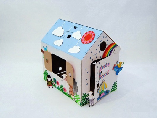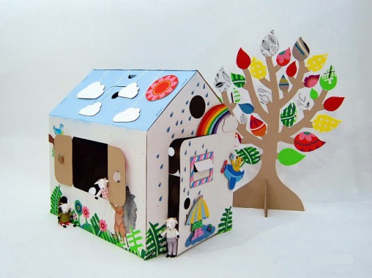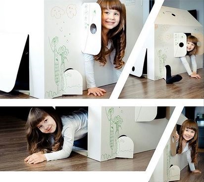 Домик сделан из экологически чистого трехслойного гофрокартона толщиной 3 мм, состоит всего из трех деталей и собирается за 10 минут с помощью пластиковых стяжек (они в комплекте) через заранее подготовленные отверстия. Размеры домика позволяют уместиться в нем родителю одновременно с ребенком, а также проносить его через большинство межкомнатных дверей.