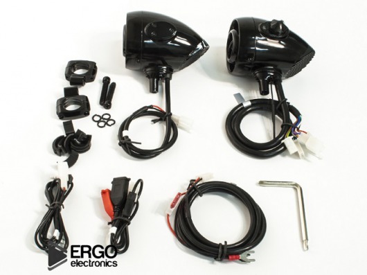 Акустика для мотоцикла Ergo ER500M - это 2 динамика 3 дюйма высочайшего качества в металлическом литом корпусе со встроенным усилителем и интерфейсами подключения Bluetooth, USB, AUX IN защищенные от пыли и влаги по классу IP65 + необходимый крепеж для установки на руль и проводка.