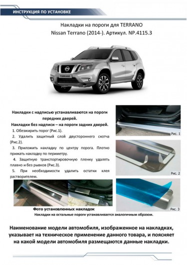 Данные накладки на внутренние пороги «Риваль» разработаны специально для автомобилей Nissan Terrano от 2014 г.в. и полностью повторяют их геометрию. Кроме того, накладки порогов двери Rival очень легко и быстро устанавливаются. И при этом надежно крепятся за счет плотного прилегания морозостойкого скотча.