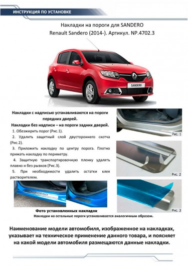 Данные накладки на внутренние пороги «Риваль» разработаны специально для автомобилей Renault Sandero от 2014 г.в. и полностью повторяют их геометрию. Кроме того, накладки порогов двери Rival очень легко и быстро устанавливаются. И при этом надежно крепятся за счет плотного прилегания морозостойкого скотча.
