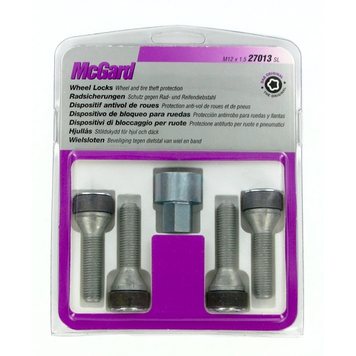 Секретные колесные болты McGard Premium Wheel Locks 27013 SL с конусным основанием и шагом резьбы M12х1,5 гарантированно защитят колеса и диски вашего авто от кражи. Для этого вам достаточно будет установить по 1-му болту-секретке на каждое колесо. Для дополнительной защиты болты оснащены специальным вращающимся кольцом, которое препятствует откручиванию секретки с помощью плоскогубцев.