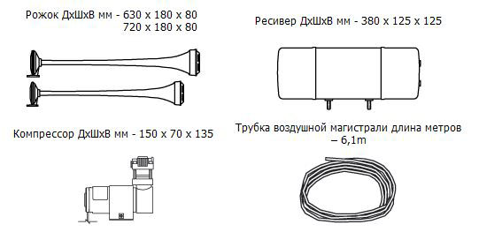 Комплект KIT 977 — это ярковыраженный бас на службе Вашего автомобиля. Вы можете разместить устройство под капотом или снаружи автомобиля на свое усмотрение. Основные запчасти можно расположить в разных частях машины: рожок, конечно же, ставится в передней части машины, а вот ресивер и компрессор — в багажнике либо салоне (если нет места в моторном отсеке).