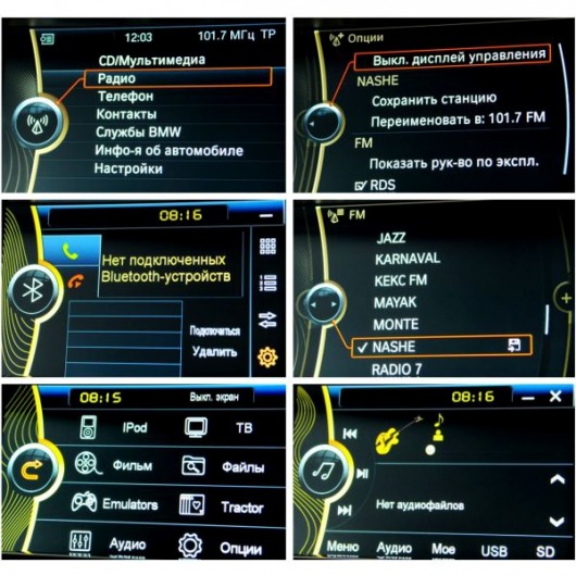 Устройство создано с учетом специфики BMW. Предусмотрено абсолютно все: и интерьер автомобиля, и цвет панели, и даже подсветка кнопок! Воспроизводит модель практически все ныне известные видео- и аудиоформаты: MP3, WMA, WAVE, MPEG1/2, MPEG4, WMV, JPEG, GIF, PNG, BMP, MS-Word, Excel, PowerPoint, Adobe PDF, *.txt.