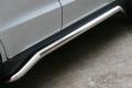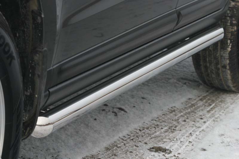 Боковые пороги на Hyundai ix35 из нержавеющей стали диаметром 76 мм не боятся коррозии, сколов и царапин и выдерживают большие нагрузки. Боковые подножки-пороги трубой с проступями сделаны специально для автомобилей Hyundai ix35 от 2010 г.в., легко устанавливаются и стильно смотрятся.