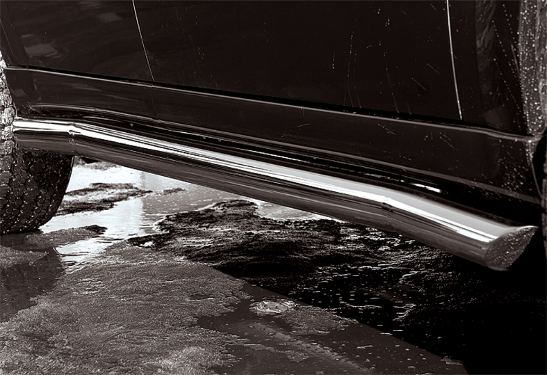 Боковые пороги на SsangYong Actyon из нержавеющей стали диаметром 76 мм не боятся коррозии, сколов и царапин и выдерживают большие нагрузки. Боковые подножки-пороги трубой сделаны специально для автомобилей SsangYong Actyon от 2013 г.в., легко устанавливаются и стильно смотрятся.
